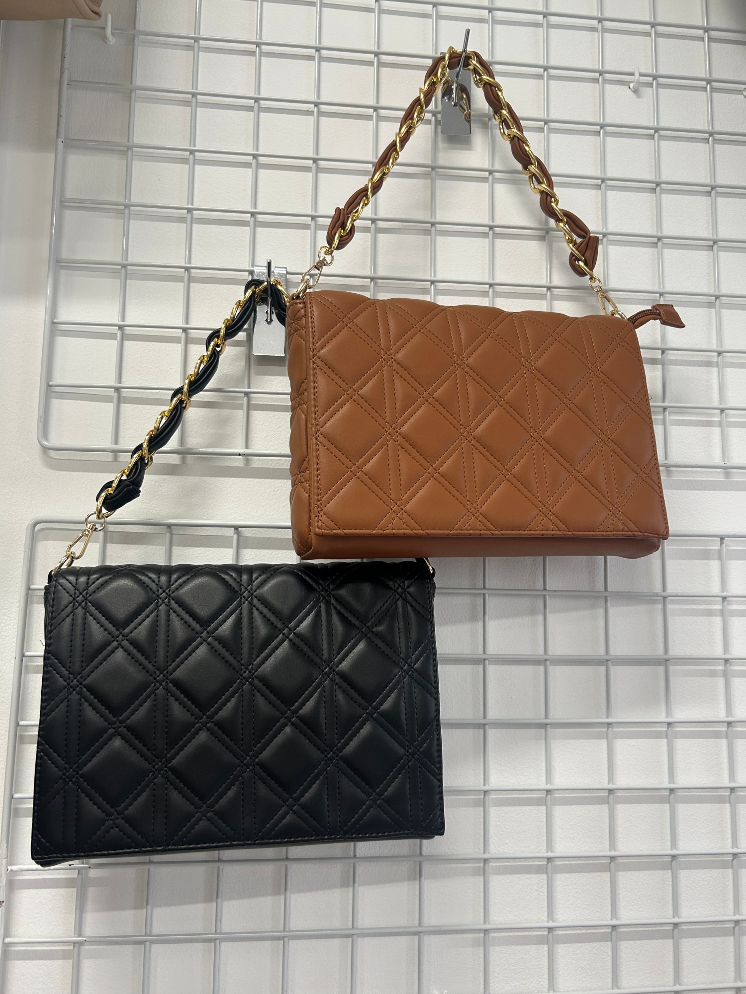 Bolso de piel sintética con relieve y detalle dorado en la correa. Disponible en negro y camel.