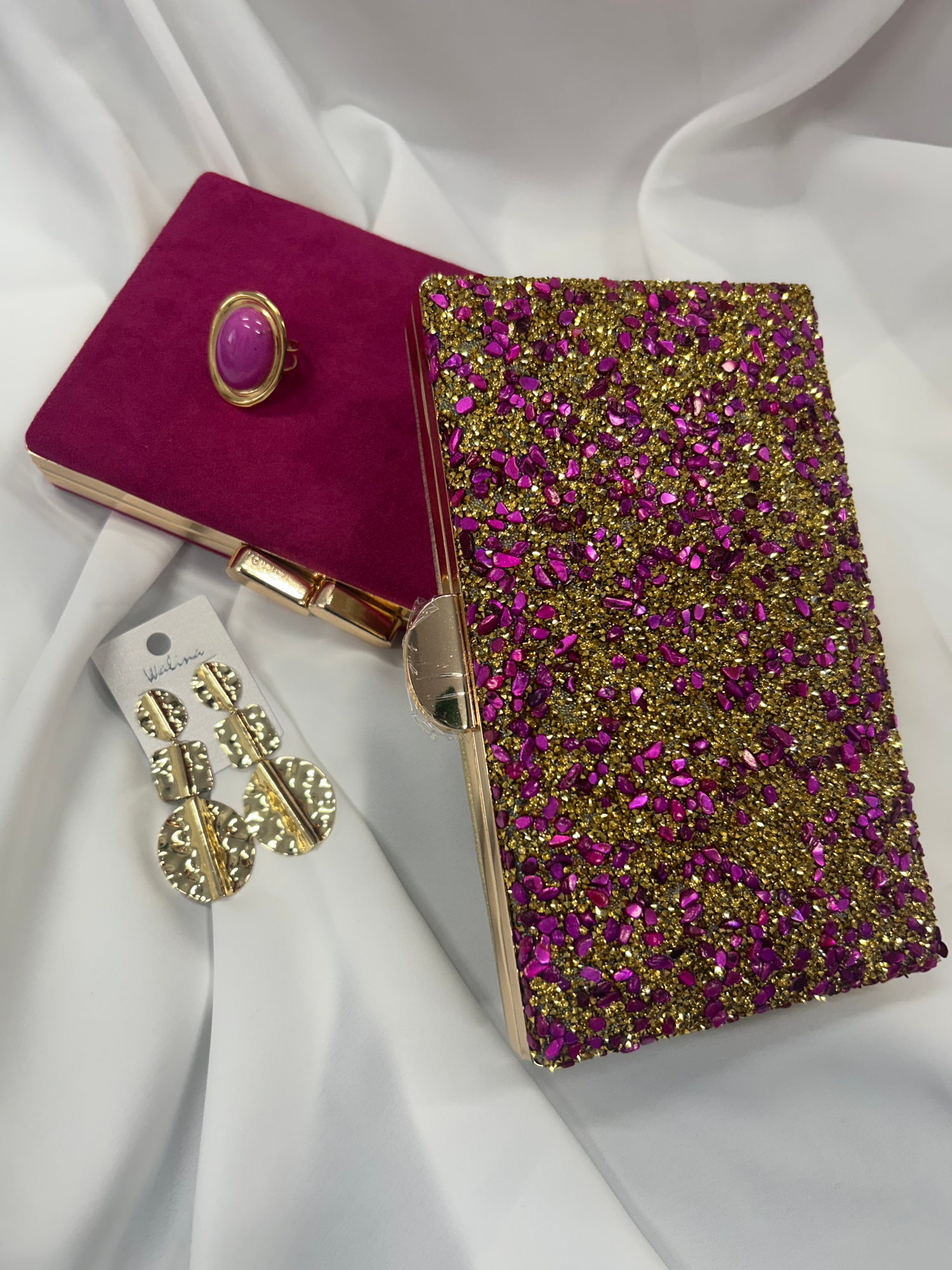 Bolso de fiesta rectangular con cierre dorado. Disponible en antelina rosa o con detalles de pedrería.
