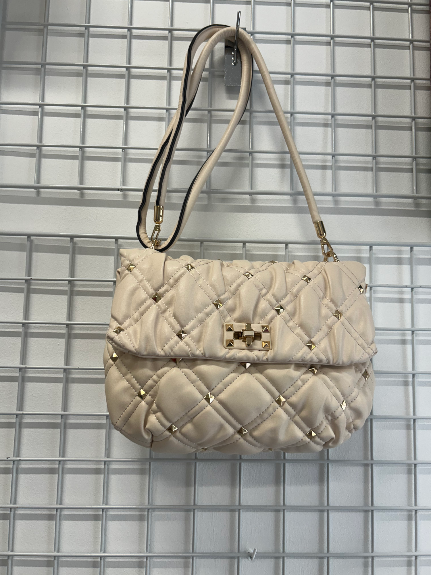 Bolso con relieve y detalles de tachuelas doradas, cierre de clic y correa ajustable.