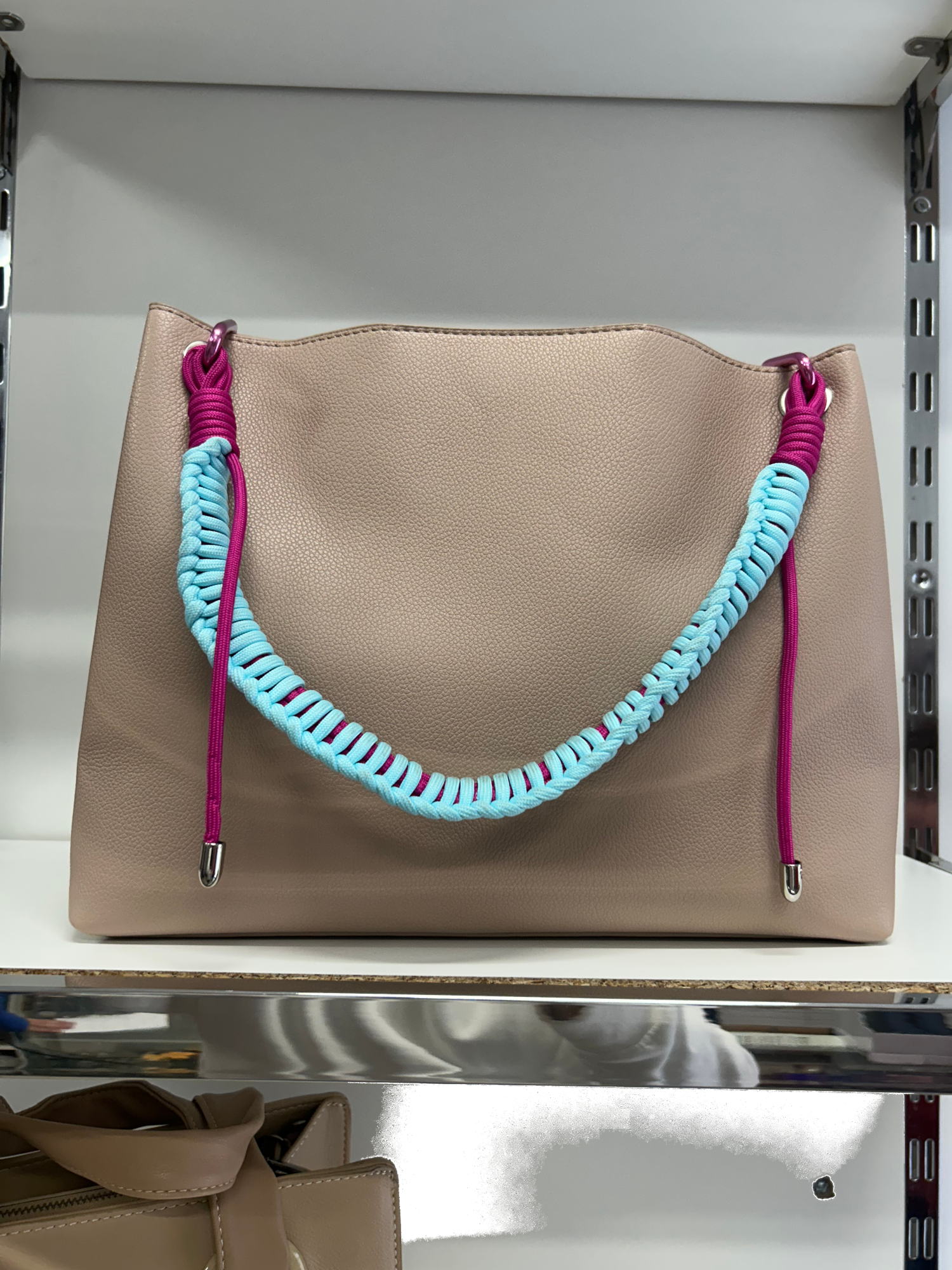 Bolso shopper color beige con correa trenzada en hilo buganvilla y turquesa.